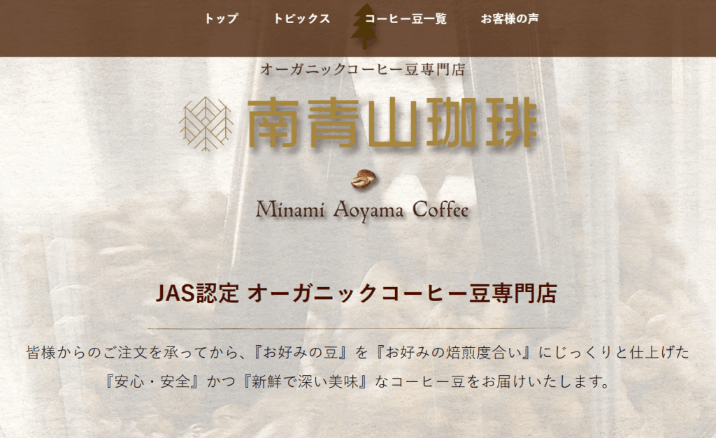 「南青山珈琲」は、JAS認定のオーガニックコーヒー豆専門店です。注文を受けてから「お好みの豆」を「お好みの焙煎度合い」にじっくり仕上げることで、新鮮で深い味わいのコーヒーを提供しています。