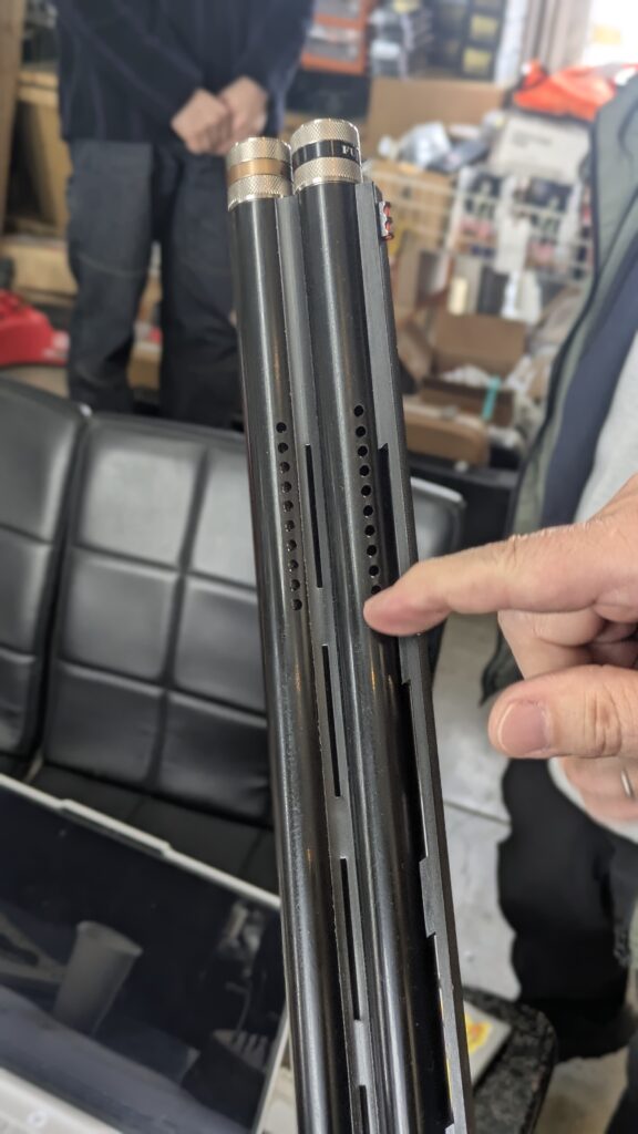 ②ポーテッド加工: 銃口に開けられた穴が発射ガスを逃がし、撃った瞬間の銃身の跳ね上がりを抑えます。2発目を素早く、正確に撃つための大きな助けになります。